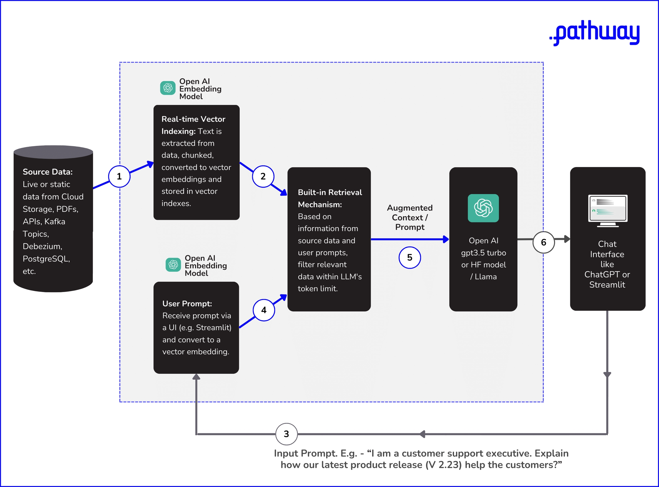 Dynamic Vector Indexing: Text from these data sources is broken down into smaller segments (also called "chunks") and converted into vector representations. Models specialized for text embeddings, such as OpenAI's text-embedding-ada-002, are employed here. These vectors are continuously indexed to facilitate rapid search later on.